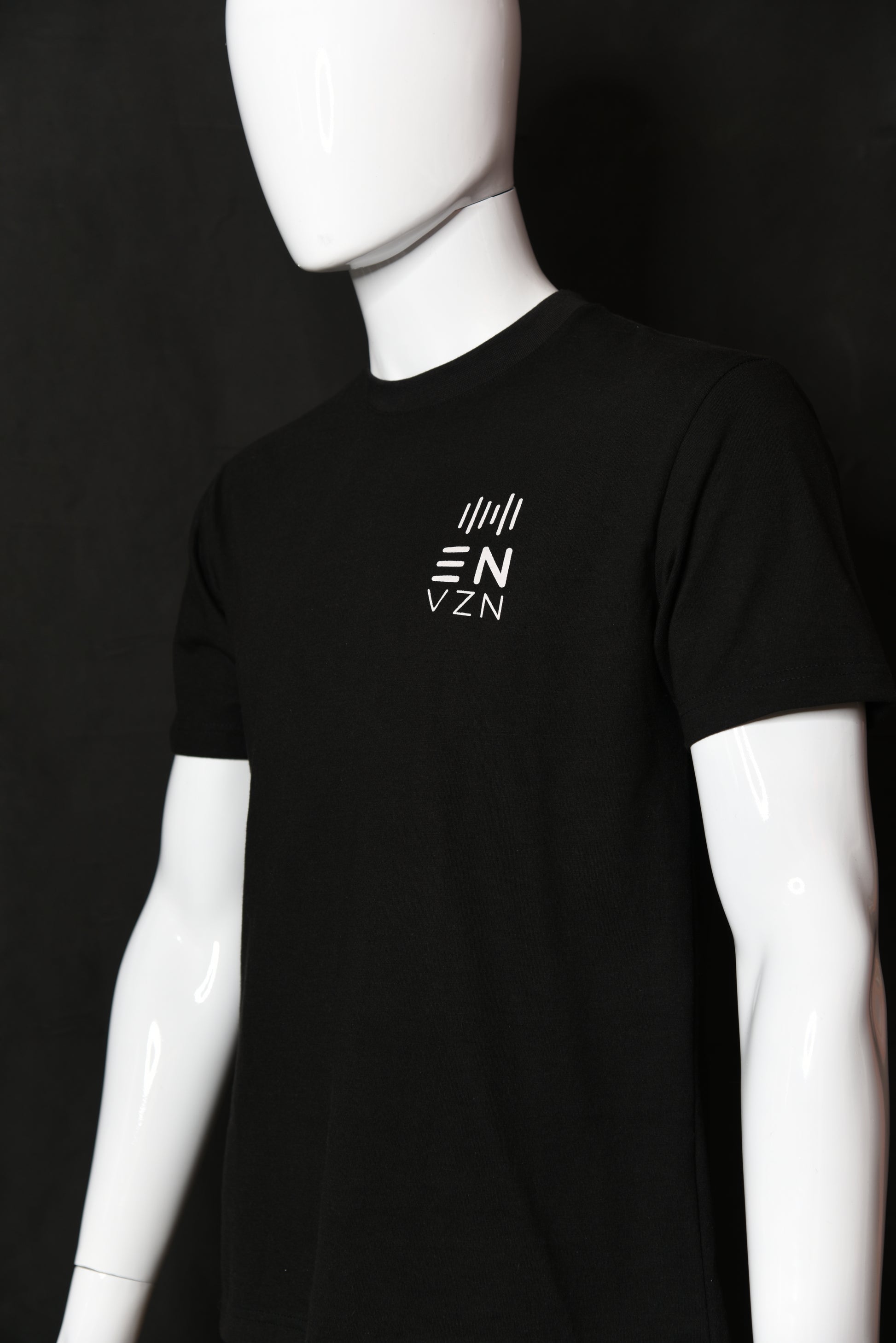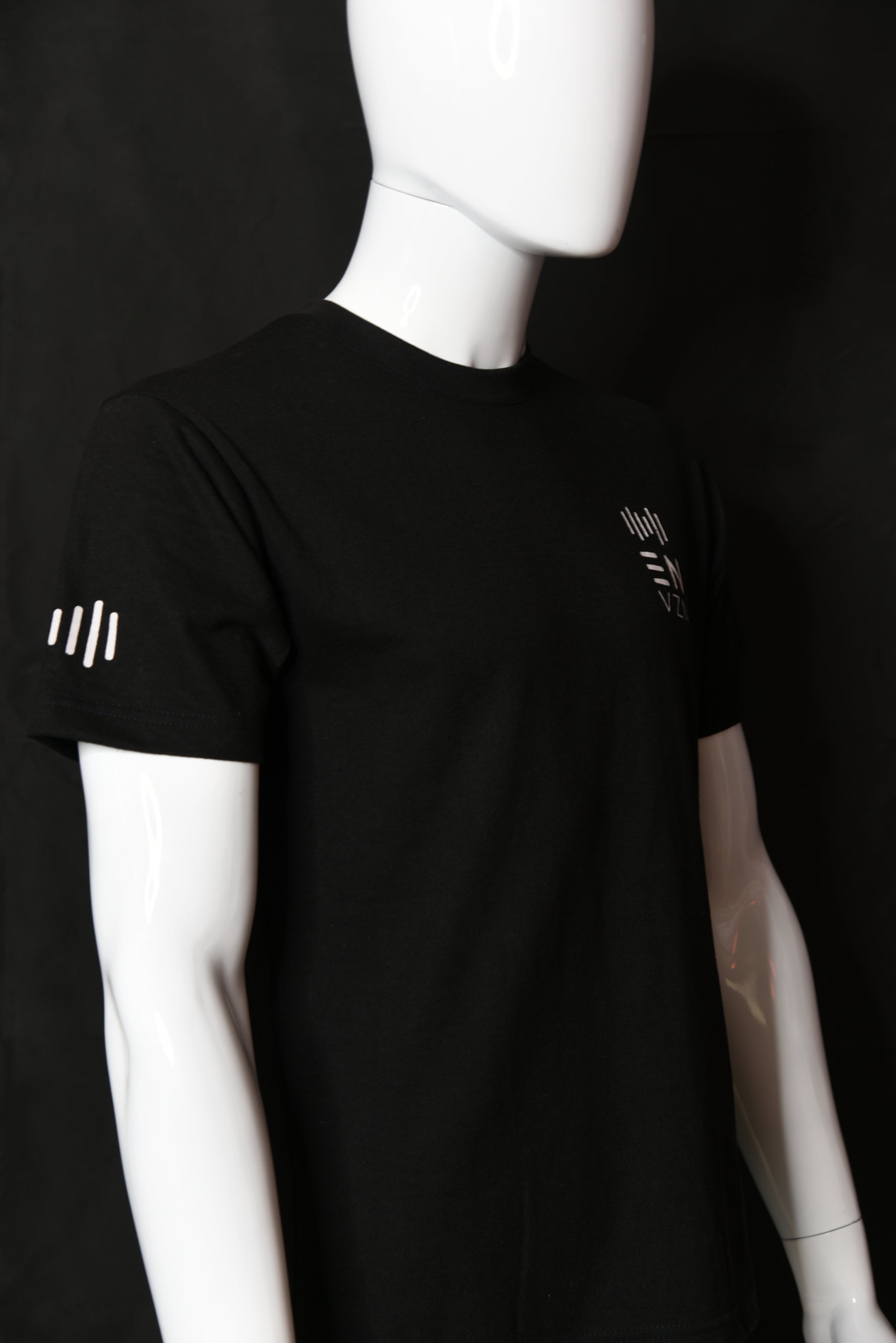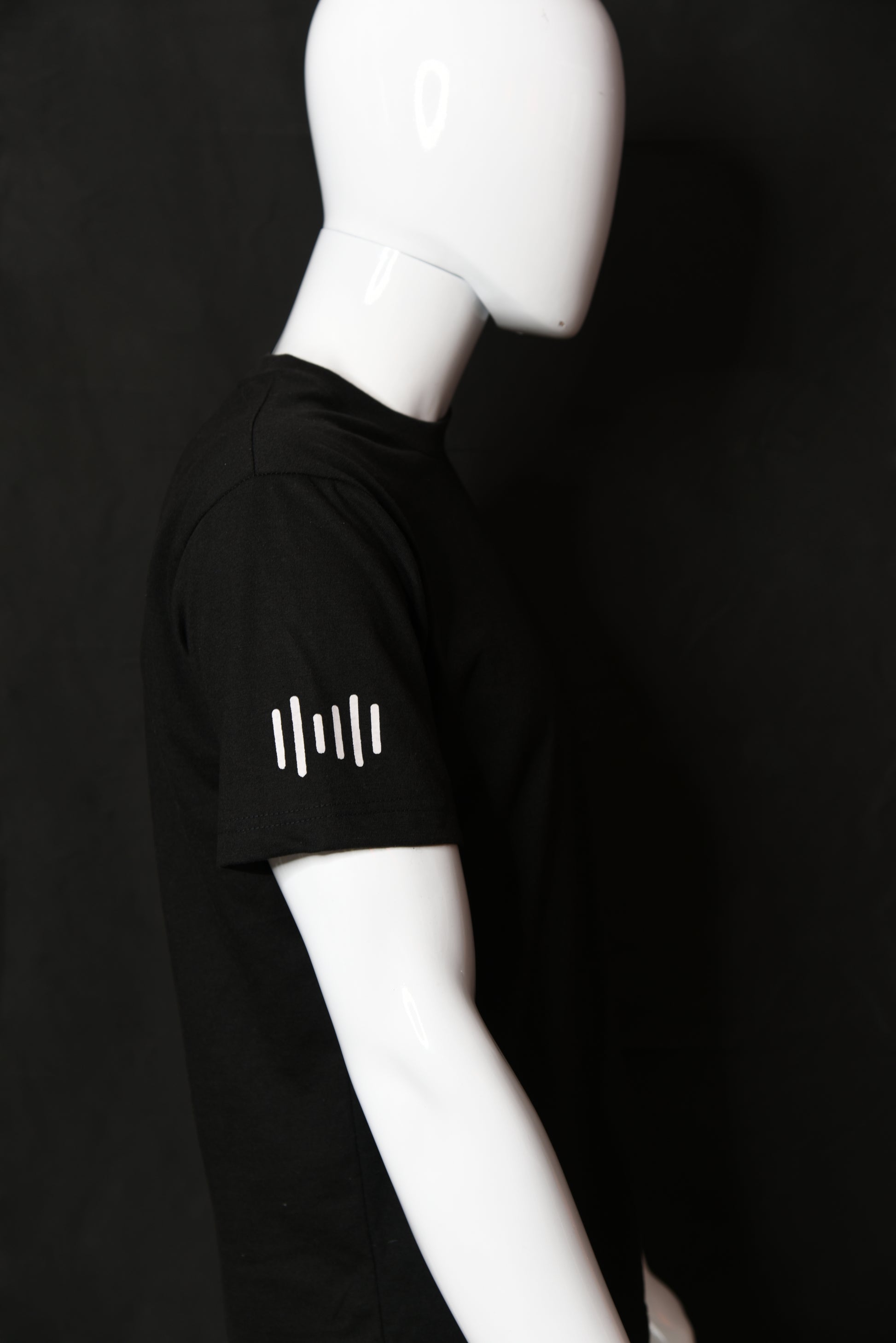 Deep black, short sleeved t-shirt, with white printed branding on the left chest and icon on the right sleeve.